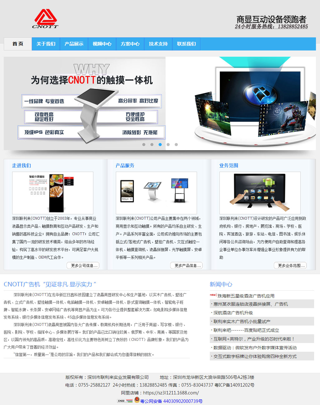 深圳聯(lián)利來(CNOTT)在龍華新區(qū)日鑫科技園建立了液晶商顯研發(fā)中心和生產(chǎn)基地,以實木廣告機、壁掛廣告機、立式廣告機、壁掛觸摸一體機、電腦觸摸一體機、安卓觸摸一體機、臥式查詢觸摸一體機、智能電子班牌、智能水牌、長條屏、安卓網(wǎng)絡廣告機等商顯產(chǎn)品為主。可為各行業(yè)提供整套解決方案,如電影院多媒體信息發(fā)布系統(tǒng)、銀行多媒體信息發(fā)布系統(tǒng)、4S店多媒體信息發(fā)布系統(tǒng)。