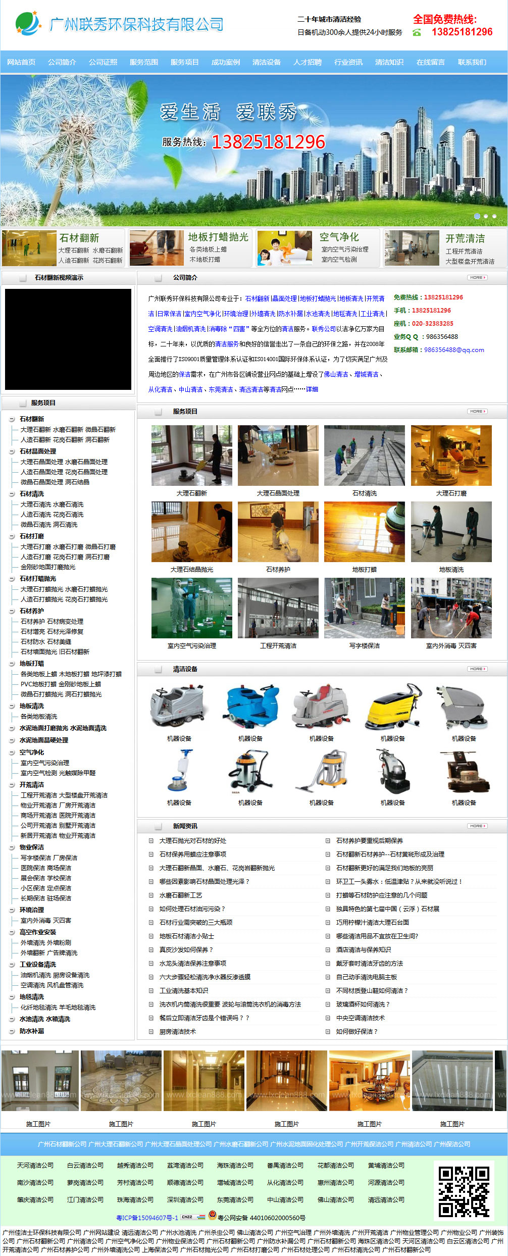 廣州聯(lián)秀環(huán)保科技有限公司專業(yè)承接:石材翻新養(yǎng)護(hù)|晶面處理|地板打蠟拋光|地板清洗|開荒清潔|日常保潔|室內(nèi)空氣凈化|環(huán)境治理|高空外墻清洗|高空作業(yè)安裝|防水補(bǔ)漏|水池清洗|地毯清洗|工業(yè)設(shè)備清洗|空調(diào)清洗|油煙機(jī)清洗|消毒除“四害”等全方位的清潔服務(wù)。經(jīng)過長期的清洗保潔工作,使公司成為一家具備了豐富的專業(yè)經(jīng)驗(yàn)及完善的清潔人員組織,技術(shù)管理系統(tǒng)的環(huán)保清潔公司。此外公司還擁有各類進(jìn)口專業(yè)清潔保養(yǎng)設(shè)備,齊全的清潔工具,清潔器具,環(huán)保清潔劑,還擁有一支經(jīng)驗(yàn)豐富,技術(shù)規(guī)范,扎實(shí),素質(zhì)優(yōu)秀,人員穩(wěn)定的專業(yè)清潔隊(duì)伍,員工實(shí)際工作五年以上的達(dá)80%,清潔管理人員,清潔技術(shù)人員均工作八年以上。目前,公司已具備了對(duì)高級(jí)寫字樓、賓館、大廈、酒店、小區(qū)、工廠等樓宇進(jìn)行全面清洗保潔的能力。二十年來,廣州聯(lián)秀環(huán)保科技有限公司以優(yōu)質(zhì)的清潔服務(wù)和良好的信譽(yù)走出了一條自己的環(huán)保之路,并在2008年全面推行了ISO9001質(zhì)量管理體系認(rèn)證和ISO14001國際環(huán)保體系認(rèn)證。