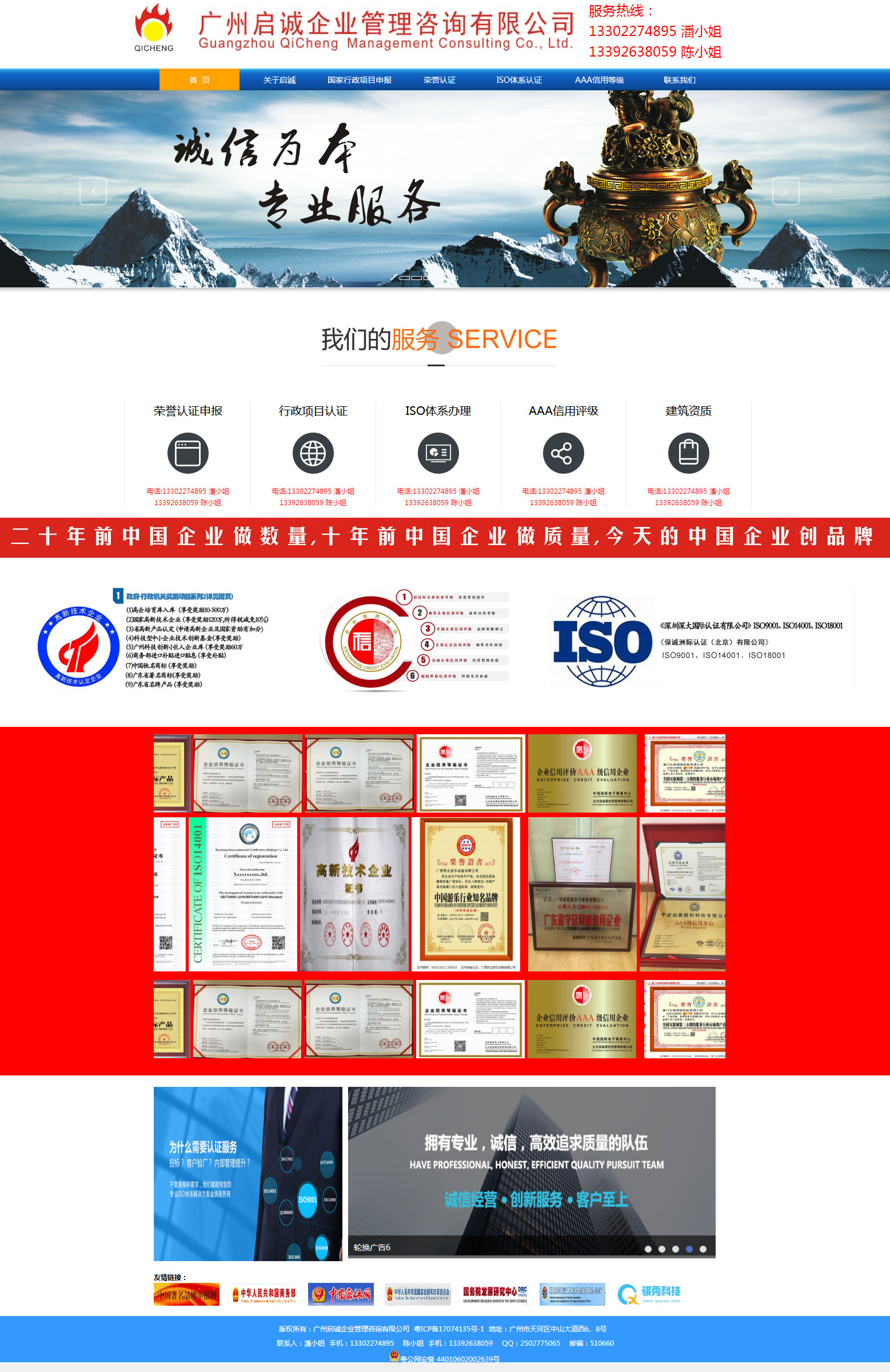 廣州啟誠企業管理咨詢有限公司是一家專業從事ISO9001 、ISO14001 、OHSAS18001、HACCP、ISO22000、ISO/TS16949等管理體系認證咨詢以及各類榮譽證書代辦的咨詢機構。前期公司以ISO管理體系認證、AAA信用評級、科技項目咨詢申報、知識產權顧問、中國馳名商標、廣東省名牌、廣東省著名商標等代理申報和企業形象策劃、及企業管理培訓... 后期公司以各類建筑資質申辦 、增項、升級等項目。在省內享有較高的聲譽,得到廣大客戶的信奈與支持。