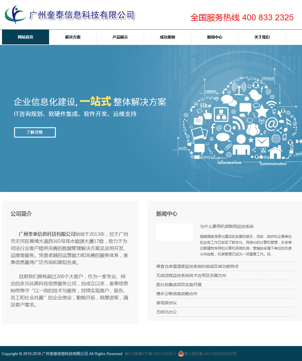 廣州奎泰信息科技有限公司始創于2013年,位于廣州市天河區黃埔大道西365號珠水能源大廈17樓,致力于為司法行業客戶提供完善的數據管理解決方案及應用開發、運維等服務。憑借卓越的運營能力和完善的服務體系,奎泰信息贏得廣泛市場和高知名度。