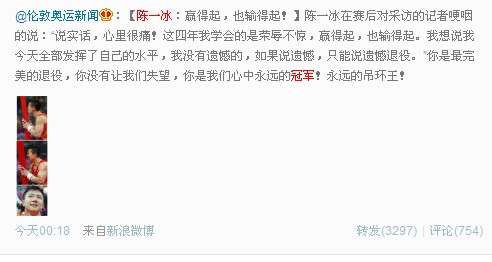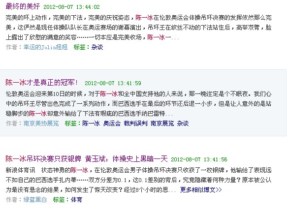 相信廣大新聞媒體通過文稿形式向我們傳遞著這樣一種信息,那就是“陳一冰是冠軍,應該獲得金牌”,大家看以下截圖,是在新浪博客搜索中看到的,可以看到,一個事件,有“30134”篇文章出現?!?/P>