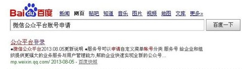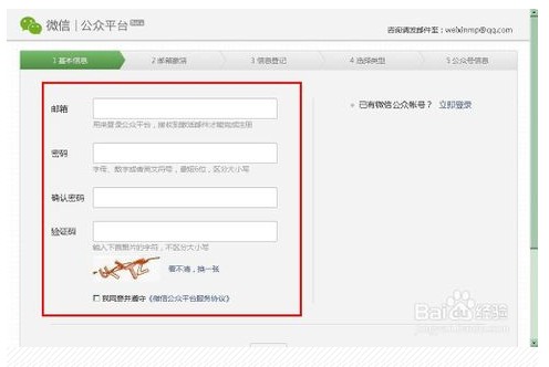 我們首先百度一下微信公眾平臺申請的地址,地址有點長,不是誰都能記得,所以直接百度或谷歌一下就可以了。填寫基本信息,郵箱和平臺密碼。